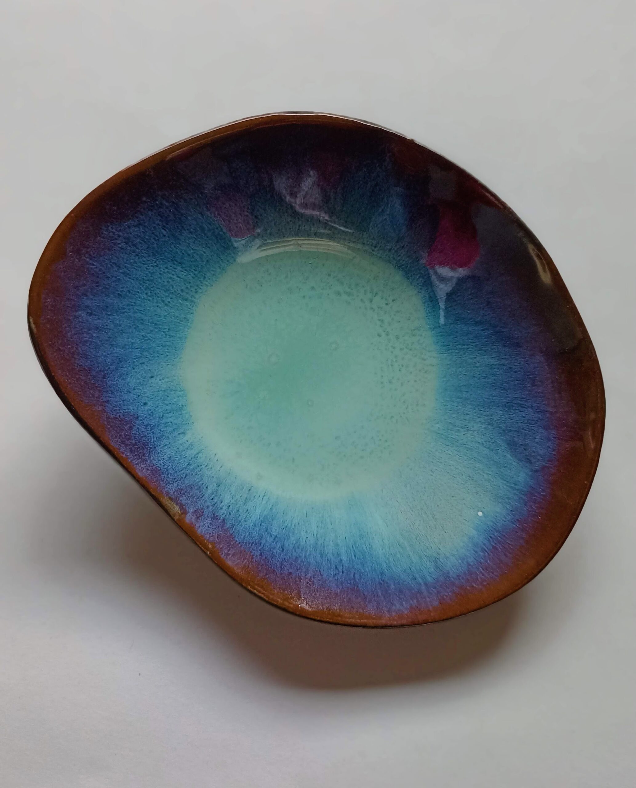 Mali party krožnik organske oblike, prelivajoča modra glazura na črni glini, dim.cca16x13cm