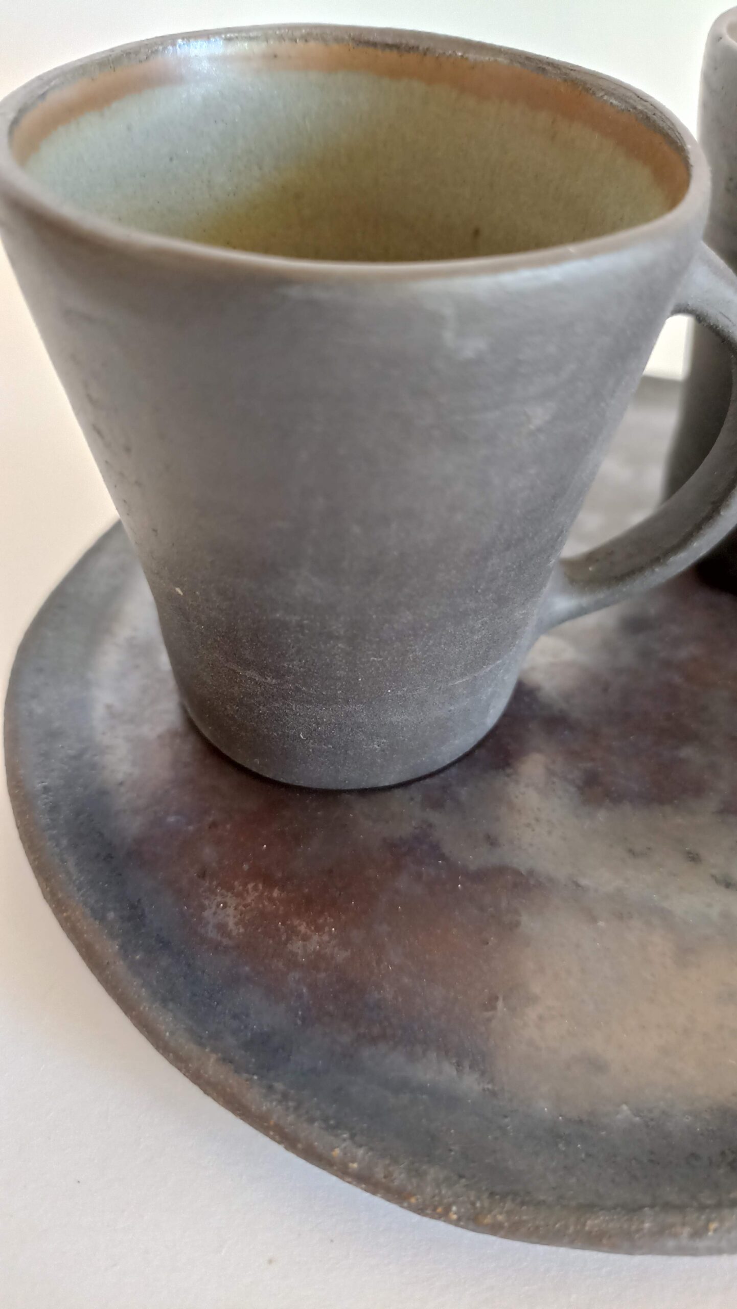 Skodelici za espresso, siva mat glazura znotraj, črna glina, pladenj 15x20 cm